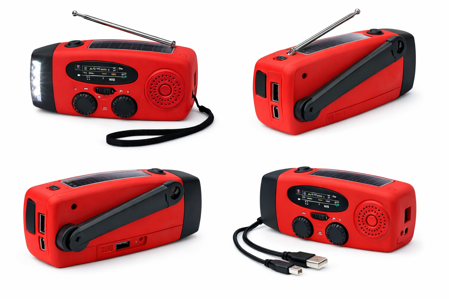 Charging methods: Hand crank, solar panel, USB input